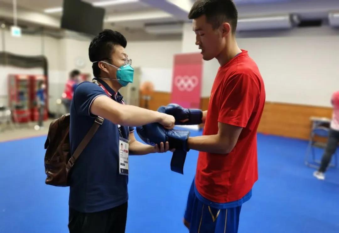 东京奥运会拳击热身馆,k1集团工作人员帮助运动员穿戴拳击手套