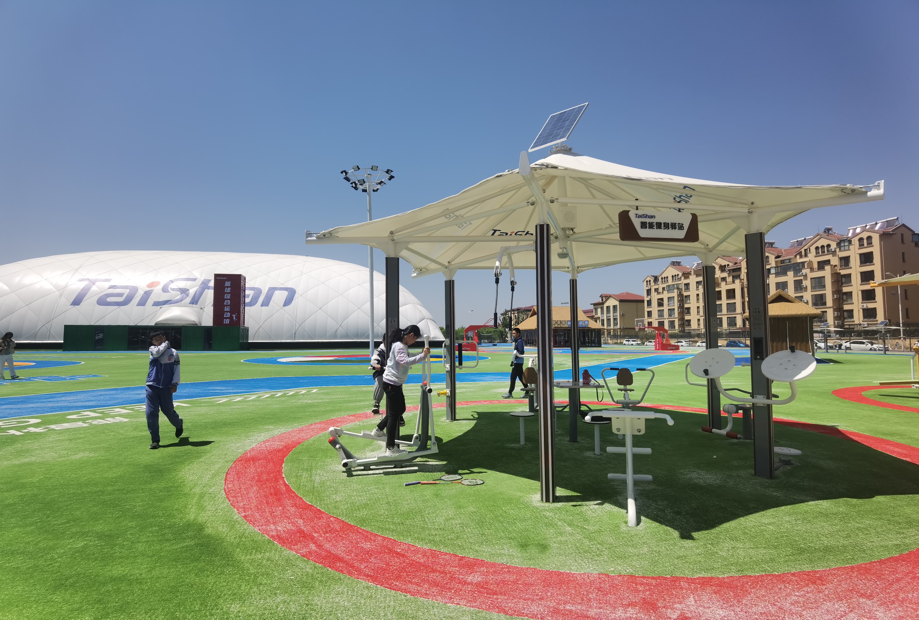 在场地铺设上,均采用k1新材料功能人造草铺设,全方位保证运动安全和环保;气膜式篮球综合运动馆,内部设置2片篮球场、6片乒乓球场地及1片网球场。网球场同时套线4个羽毛球场地。场馆内可以满足体育运动,体育教学及群众比赛需求。从场馆到运动超市、智慧体测小屋,全部采用可装配式建筑。
